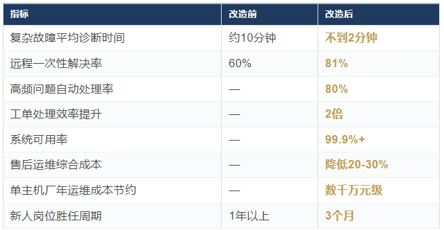 平台构建故障理解Agent、诊断决策Agent、备件推荐Agent、派工调度Agent、复盘学习Agent五大协同Agent体系。典型工单从报修到生成维修方案与备件清单的时间,由30分钟缩短至3-5分钟,高频问题自动处理率达到80%,工单整体处理效率提升约2倍。