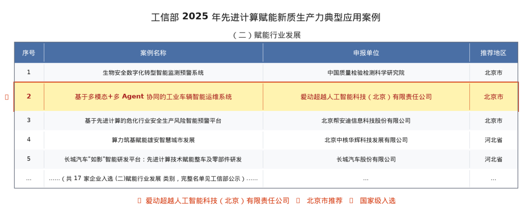 近日,工业和信息化部正式公示"2025年先进计算赋能新质生产力典型应用案例"名单。爱动超越人工智能科技(北京)有限责任公司凭借"基于多模态+多Agent协同的工业车辆智能运维系统"成功入选,由北京市经济和信息化局推荐,联合徐工集团与浙江中力机械共同申报。