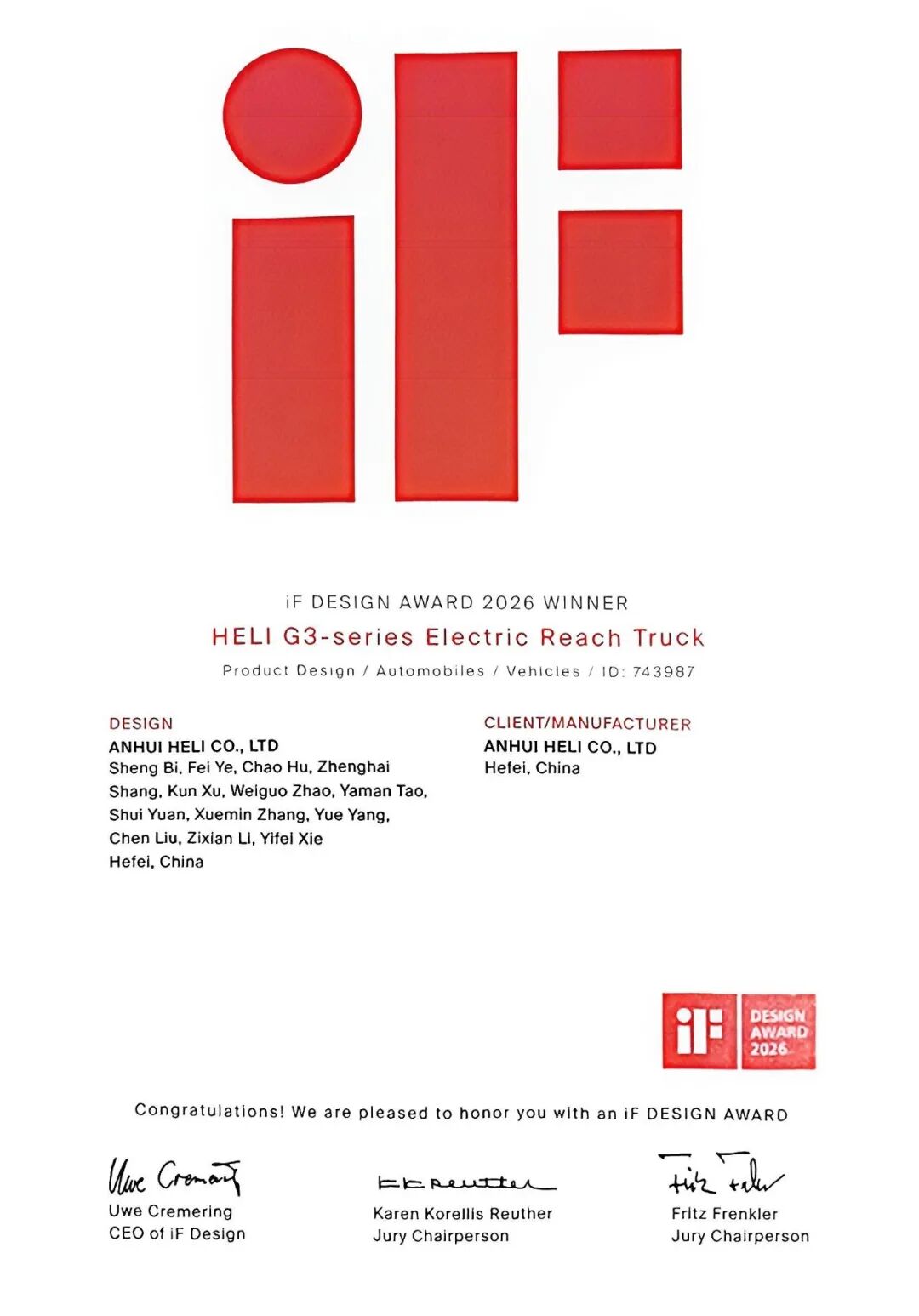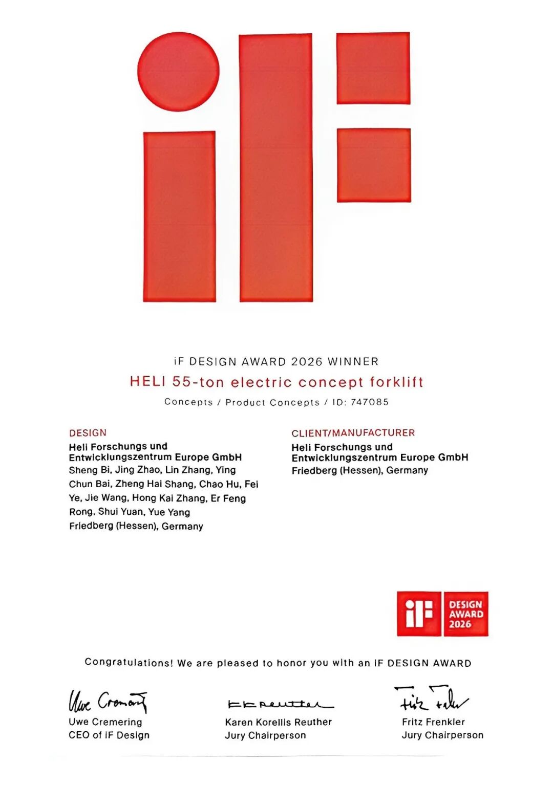 2026年4月27日,德国柏林,国际IF设计大奖(iF Design Award)颁奖典礼如期而至,全球工业设计领域的目光再次聚焦于此。作为创立于1953年的国际顶级设计奖项,IF设计奖由德国汉诺威工业设计论坛每年评选,以其独立、严谨、权威的评审标准,成为了衡量产品设计品质与创新水平的“金标杆”。每一届颁奖典礼,都是全球优秀设计成果的集中展示,而今年,来自中国的合力叉车,凭借两款重磅产品,在万件参赛作品中脱颖而出,一举摘下两项IF设计大奖,为中国工业设计赢得了世界瞩目。