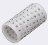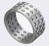 钢球保持圈,分别以铜合金、硬铝合金、POM树脂为基体,并在其外圆表面上,加工出排列有序、大小适当,形状特殊的孔穴,在其孔穴中镶入滚动轴承钢球。孔口采用最新的沟槽圆周锁球工艺,有效地解决了传统点式锁球和压痕锁球不能完全防止钢球脱落的难题。孔底加工出900止口使钢球在孔内自由转动而不脱落。由于钢球的直径大干保持圈的壁厚,所以在使用时钢球高出保持圈内、外圆表面,直接与相配的孔与轴接触,使基体(保持圈)浮于中间,并且相配的孔与轴半径之差小于钢球直径,即钢球与之配合为过盈配合,配合精度高,轴与孔相对运动灵活。是保持圈的更新换代产品。