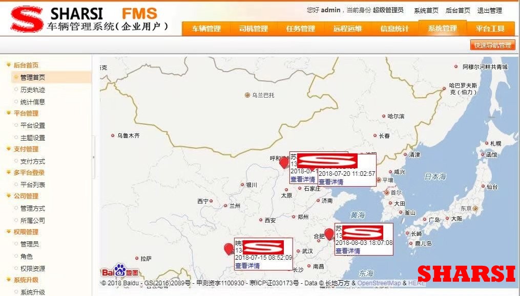 登陆系统内部首页,以地图标记的形式把系统内所有车辆都标识出来,并显示特征信息,简单明了、一目了然。让日常工作更简单直观。
