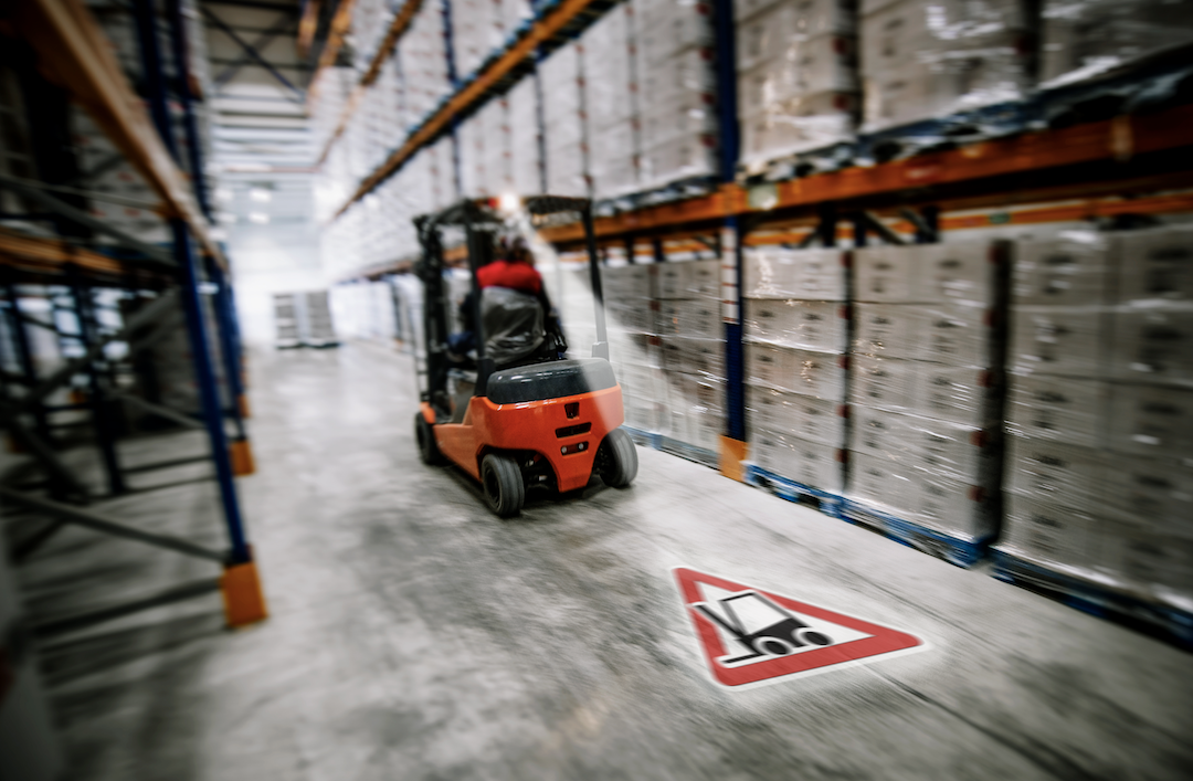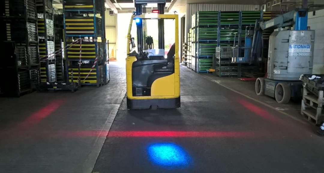 安全投光灯发出清晰可见的警告信号,表明正在接近物料搬运设备