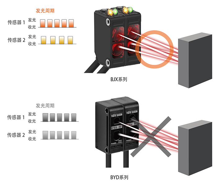 防相互干扰工能 (对射型除外)通过改变传感器的发光周期,相邻传感器之间互不影响,可以并排紧密安装。