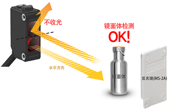 镜面反射型具有MSR(镜面抑制)功能,使得传感器只接收来自特定反射镜(MS-2A)的光线。 该功能可以稳定检测高反射目标,包括金属,镜子等。