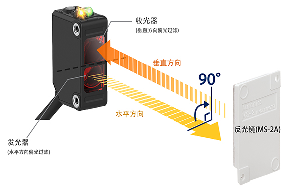 发光器发射的光线通过水平偏振滤光片后将变成水平方向,经过反光镜的反射,光线将旋转90°变为垂直方向,最终收光器仅接收通过垂直偏振滤光片的垂直光线。