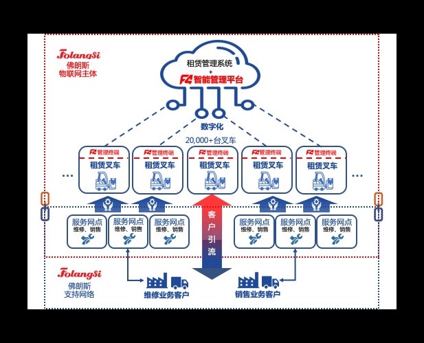 佛朗斯F4智能管理系统是聚焦场内物流设备租赁的具体需求,研发的高效的数字化资产智能管理系统,实现了组织的全面协同和产业数据共享,着重解决了场内物流设备使用的安全问题、效率问题、成本问题和服务问题。公司的物联网数据化能力促进了服务效率和客户粘性的提升,有效支撑了租赁业务的规模化健康发展,为持续、高效、规模化进行数据针对性采集提供基础,实现服务和数据的闭环。