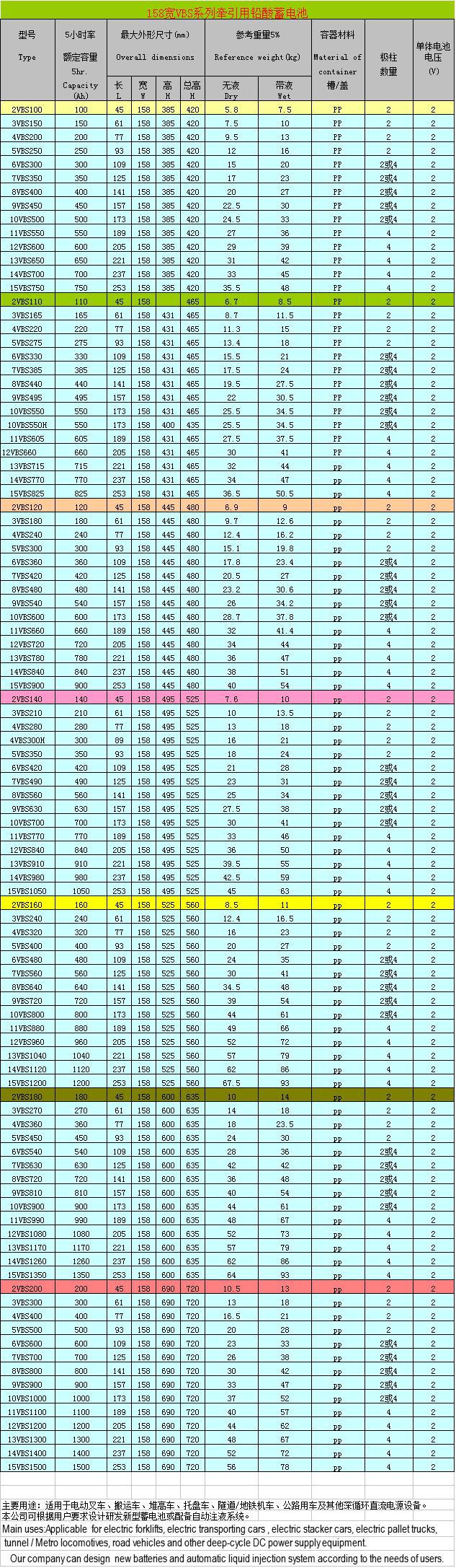 公司具备雄厚的技术力量、丰富的生产经验、先进的制造设备和齐全的检测手段。产品采用德国的VARTA公司牵引用铅酸蓄电池专有技术进行设计,按照ISO9001标准组织生产。性能符合GB(国家标准)、BS(英国标准)、DIN(德国标准)、JIS(日本标准)、BCI(美国标准)和IEC(国际电工委员会标准),具有容量大、寿命长、维护少、外型美观、稳定可靠等特点。