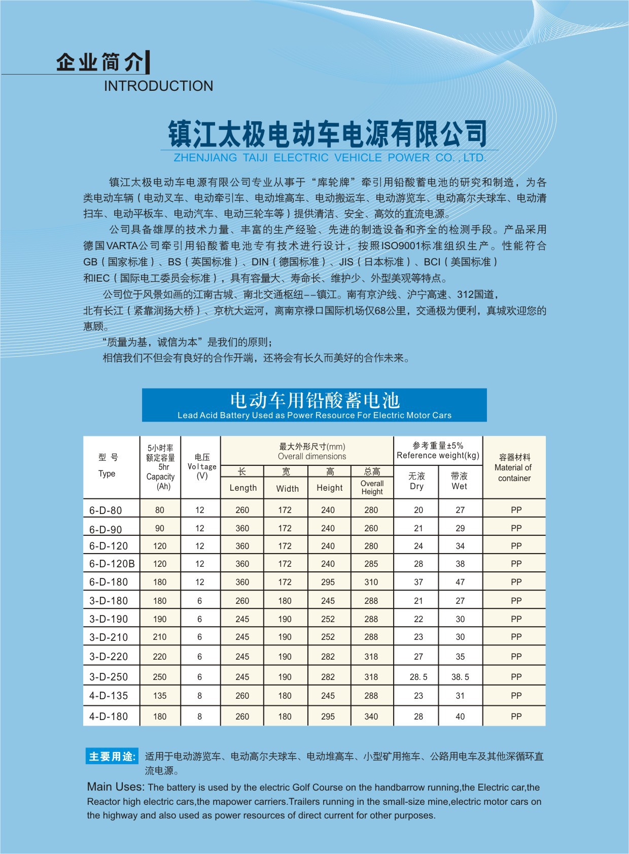 GB(国标)牵引用铅酸蓄电池镇江太极电动车电源有限公司专业从事于“库轮”牌牵引用铅酸蓄电池的研究和制造,为各类电动车辆(电动叉车、电动牵引车、电动搬运车、电动堆高车、电动游览车、电动高尔夫球车、电动游船(艇)、电动清扫车、电动工具车、电动汽车、电动三轮车等)提供清洁、安全、高效的直流电源。