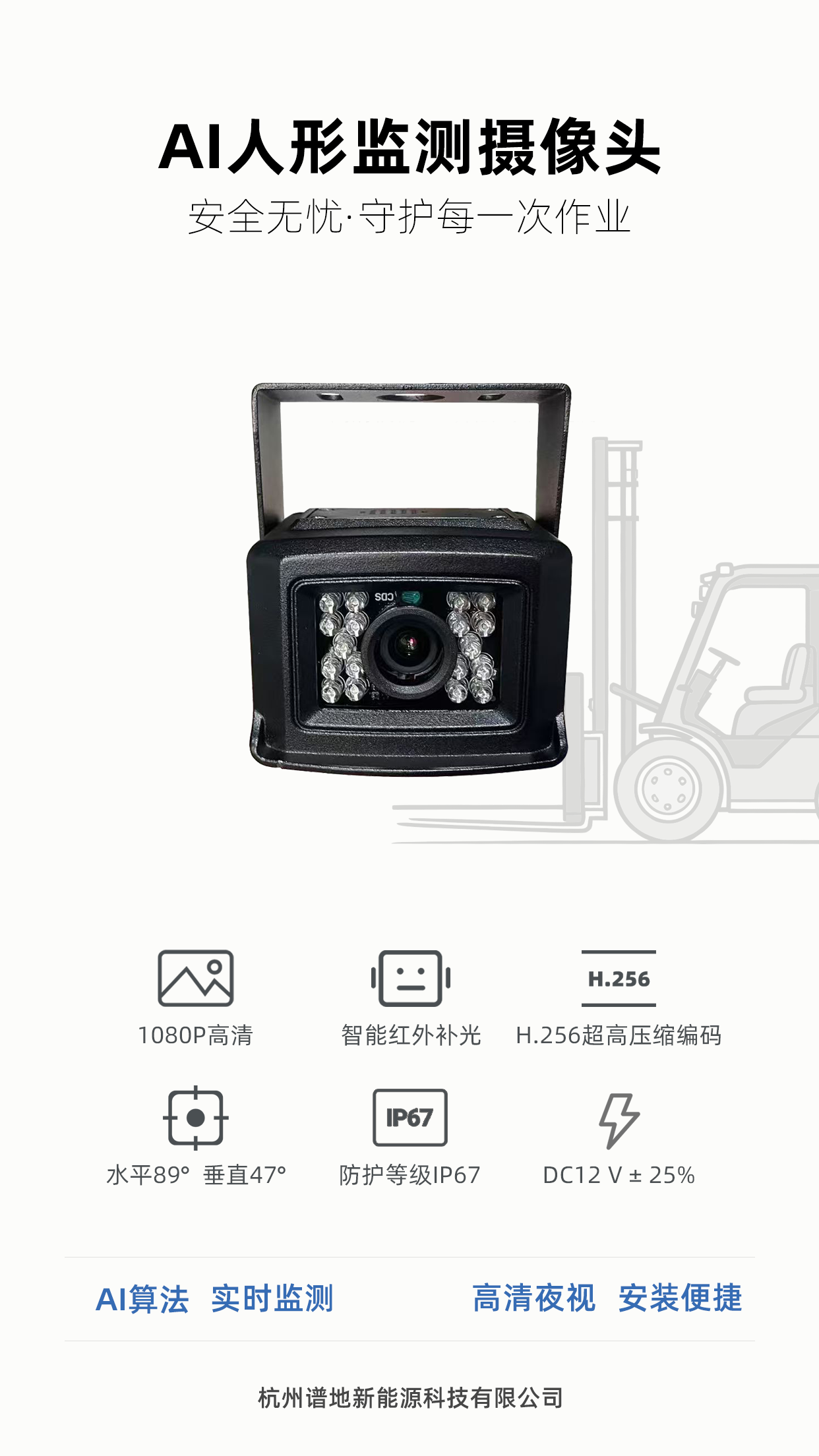 AI人形监测摄像头,利用算法精准识别叉车周围人形物,有效提高企业及操作工的安全作业意识,有效的减少叉车事故的发生。
