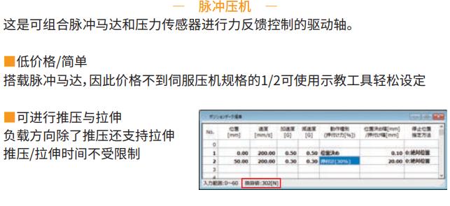 低价格/简单:搭载脉冲马达,因此价格不到伺服压机规格的1/2可使用示教工具轻松设定