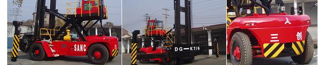 DG-K7/6 空箱堆高机由底盘、门架、集装箱吊具等部分组成。底盘由发动机、动力换档变速箱、前桥、后桥、转向系统、高架台、驾驶室、车架、配重、车轮等部件组成。门架包括起升油缸、滑架、内外门架等部件组成,与倾斜油缸及车架相连结。集装箱吊具具有主臂、左右伸缩臂、吊杆、伸缩油缸、横移油缸、旋锁油缸等部件。