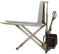 Designed to lift open bottom skids, boxes and baskets. Two operations available: hand pump and 12V DC power with rocker switch to raise or lower. Hand pump design features an ergonomic pump handle with two lifting speeds to accommodate for light or heavy loads. Side stabilizers provide balance to the unit when the load is lifted. Suffix "SS" stands for stainless steel units.