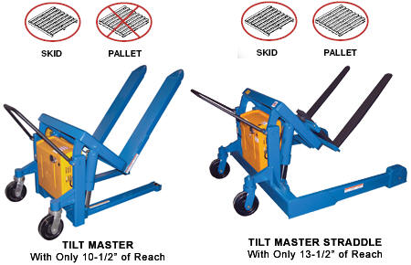 Lift and position filled tote boxes or baskets without the need of a fork truck or lift table using the newly designed heavy-duty Tilt Master. These 90° tilters will function as a transporter by moving completed products from work station to work station without waiting for a fork truck. A folding ergonomic handle has dual steering grips for quick and easy maneuverability. Unit has a thin profile to allow the user to get as close to the load as possible. These units are equipped with a floor lock. Tilt Masters, series TM, are to be used with open bottom pallets or skids while the Tilt Master Straddle units, series TMS, can be used with virtually any kind of container or pallet. Units are powered with a 12V DC electric motor with an on-board battery charger standard. AC or *AIR/OIL reciprocating available (*filter - regulator - lubricator required).