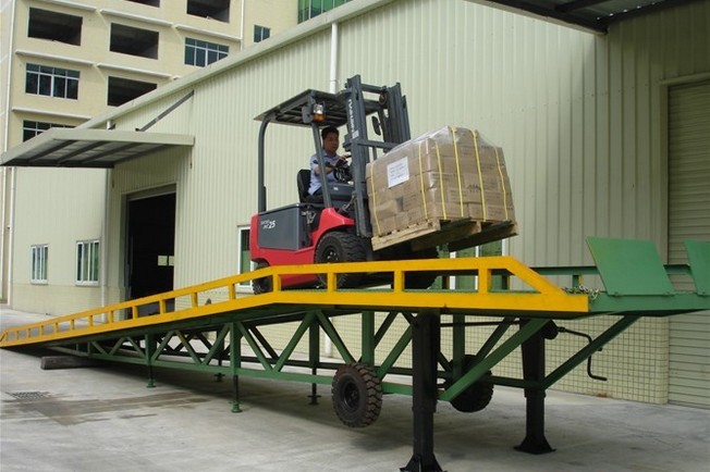 是与叉车配合使用的货物装卸辅助设备,可根据汽车车厢的高低调节高度,叉车可以直接通过本设备驶入车厢内部进行货物的批量装卸,仅需单人作业,即可实现货物的快速装卸。它使企业减少大量劳力,提高工作效率,获取更大经济效益