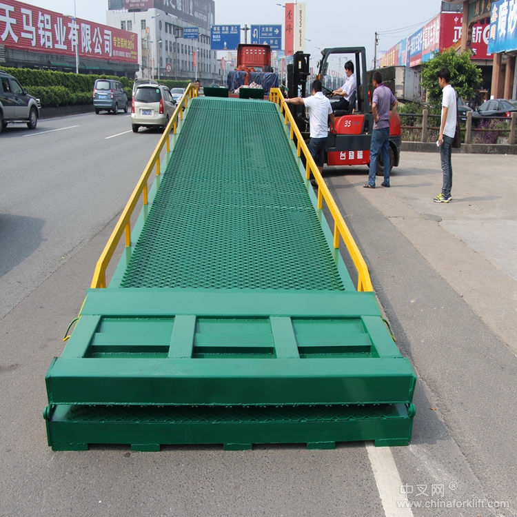 产品规格:根据承载能力产品分为:6、8、10、12吨登车桥,移动式登车桥是叉车配合使用的货物装卸辅助设备,可根据汽车车厢的高低调节高度,叉车可以直接通过本设备驶入车厢内部批量作业,设备