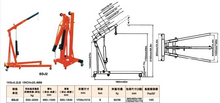 当你修理发动机或需要提起些大的重物时,这种机器将成为你能干的安全的可靠的助手,本产品操作简单,却能使你达到四两拨千斤的效果. 配8T油泵。每台分两个包装。4个万向轮子,2个固定轮,移动方便。 产品用料:70*70*3mm方管,60*60*2.75方管,3.5英寸和3英寸轮子,8吨油泵。可折叠。 1:起升高度2500mm。 2:吊杆工作范围120-1950mm。可以折叠,使用,存放方便。 3:净重73kg,每台2个包装。