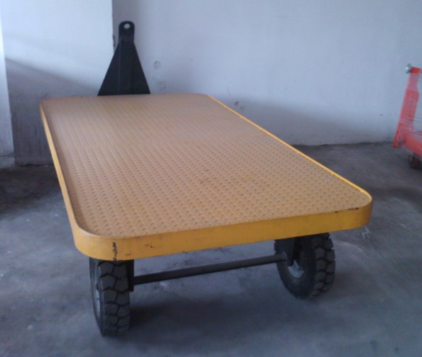 平板车 一般采用充气式实心轮胎,板面高度低、装载量大。无破胎、爆胎的危险。安全、简单而耐用。他自身无动力,需要又牵引车或者叉车来进行拖带。通常由一辆或多辆平板车和一台叉车或牵引车组成一列车辆来进行货物平面运输或大型设备的搬运工作。广泛应用于机场、港口、火车站、工厂和大型仓库。大大的提高了货物中转平移的效率。减少叉车和人力的消耗成本。   现在的平板车是一种电动有轨厂内运输车辆。又称电动平车、台车、过跨车。它具有结构简单、使用方便、容易维护、承载能力大、污染少等优点。广泛用于机器制造和冶金工厂,作为车间内部配合吊车运输重物过跨之用。KP 系列电动平车高度低,台面加强,改型容易,维修方便。