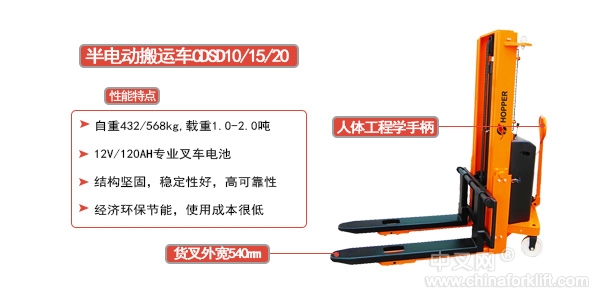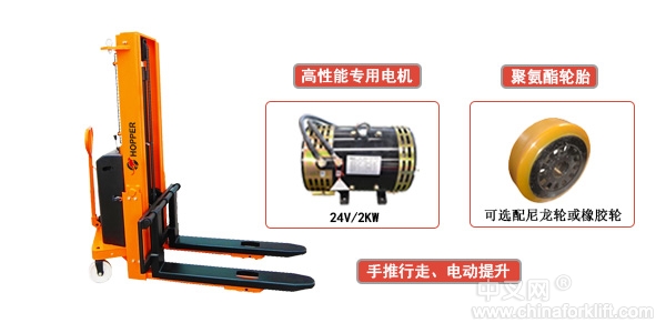 1、手推行走、电动提升的托盘堆高机械。