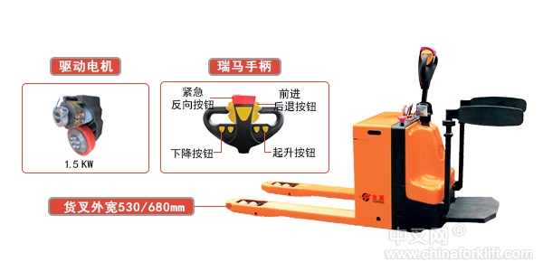 1、电动行走,电动提升的托盘搬运设备,高效、环保、安静,操作简便轻巧,是工厂、仓库托盘搬运的理想工具。