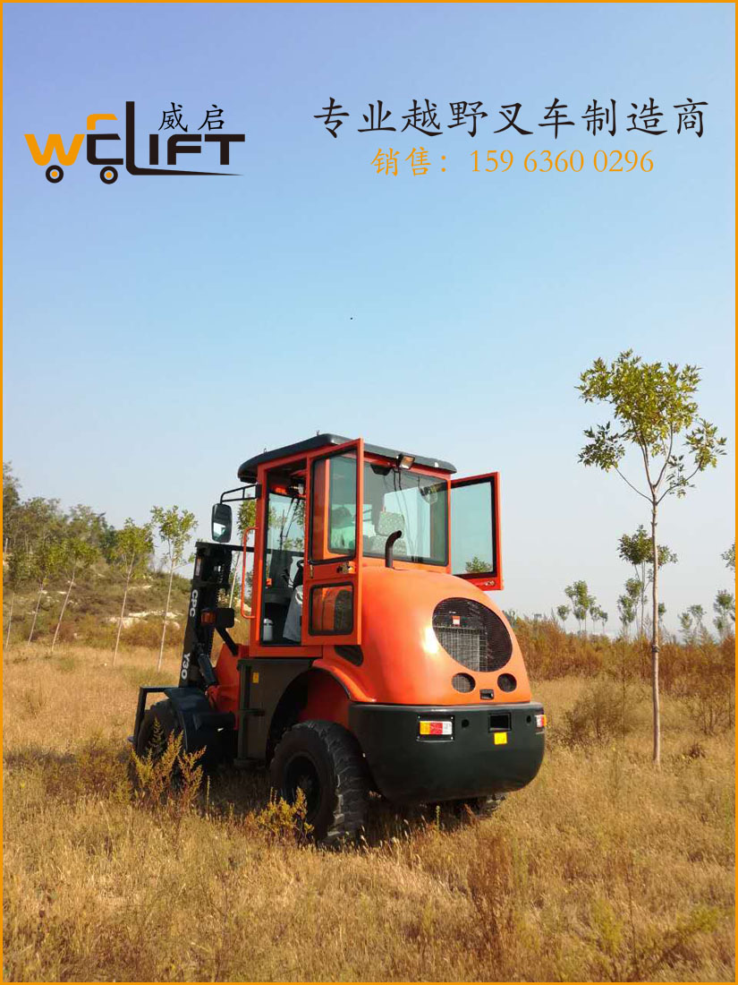 强大的越野叉车 越野叉车主要用于建筑工地、砖厂、泥泞地区等路况条件较差的物资集散地装卸物资的设备。它具备普通越野车良好的机动性与越野性,又具有普通叉车的工业实用性,可以说是一个强大的组合体。 越野叉车的速度要高于普通叉车,足见其机动性。