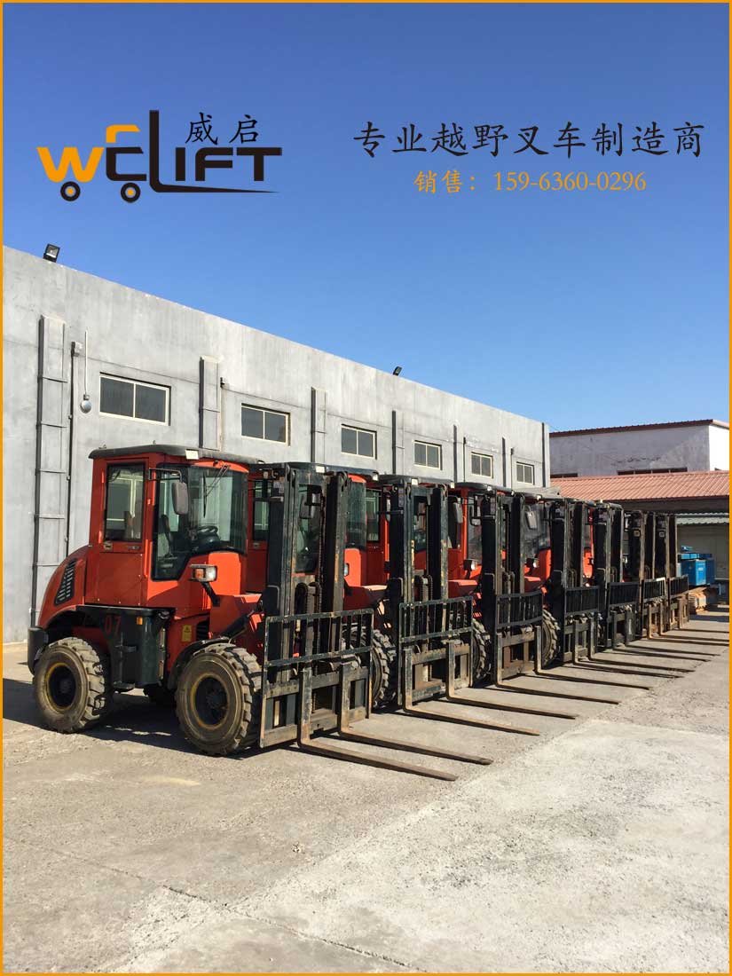 越野叉车采用全轮驱动和越野轮胎,所以可以在山地、滩头、沙地、雪地以及泥泞道路上安全行驶,展现了良好的越野性能。