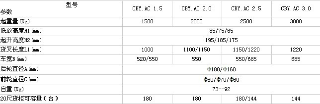 其优点有:1、采用原装进口密封件,整体阀芯,镀鉻活塞杆。2、一体式铸造轮架,配置双前轮,承载能力强。3、转动部位装配有合金衬套,能够吸收偏载,耐磨损,延长使用寿命4、优质钢板打造,所有货叉背面均有加强单位,保证车体的强度,表面静电喷塑,抗磨损5、升降平稳,下降速度可控,满载下降时无冲击。