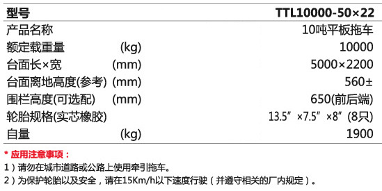 平板拖车产品描述:10000Kg 平板拖车,台面5000X2200mm,台面离地高度±560mm,采用18"X8"X14"实芯轮胎8个,前悬转盘转向系统