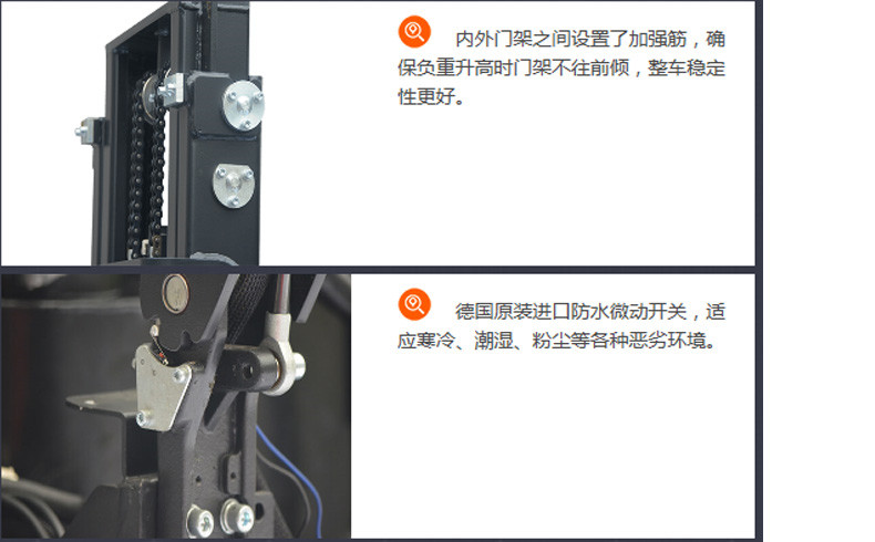 ◆内外门架之间设置了加强筋,确保负重升高时门架不往前倾,整车稳定性更好。