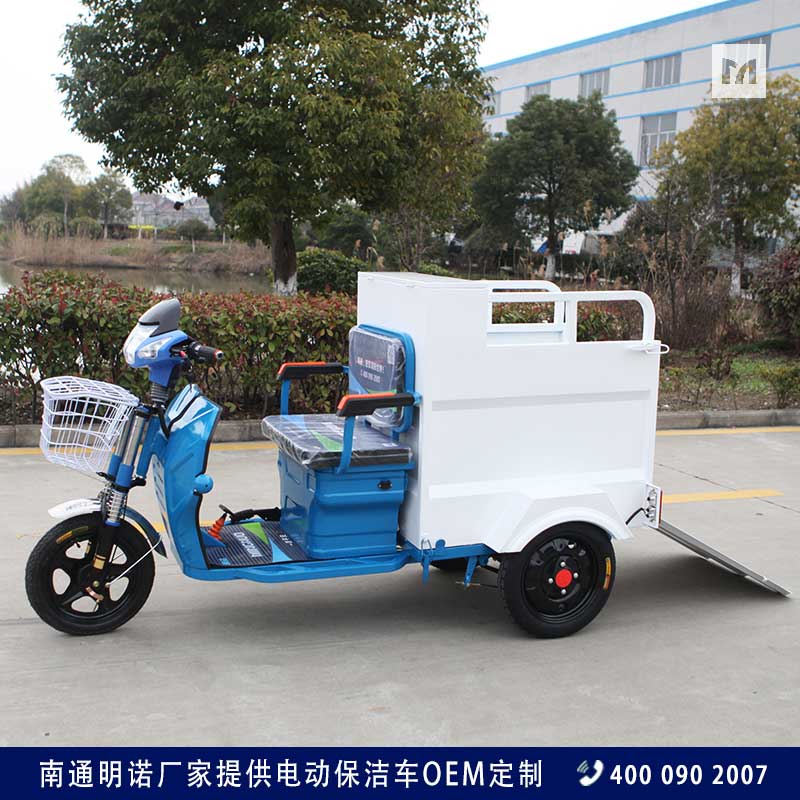 江苏保洁车厂家 明诺三轮装桶保洁车报价,江苏保洁车介绍:明诺电动三轮单桶保洁车,可装载一只240L标准垃圾桶,整车小巧灵活,随走随停,且易清洗,装卸方便,适用城镇街道、工厂、学校、医院、居民生活区、机关单位等路段垃圾收集和巡回保洁使用。