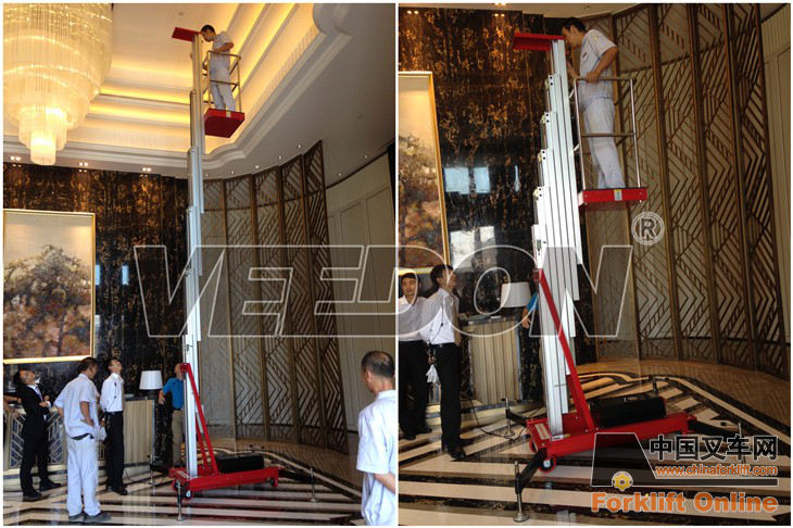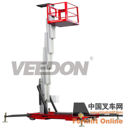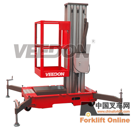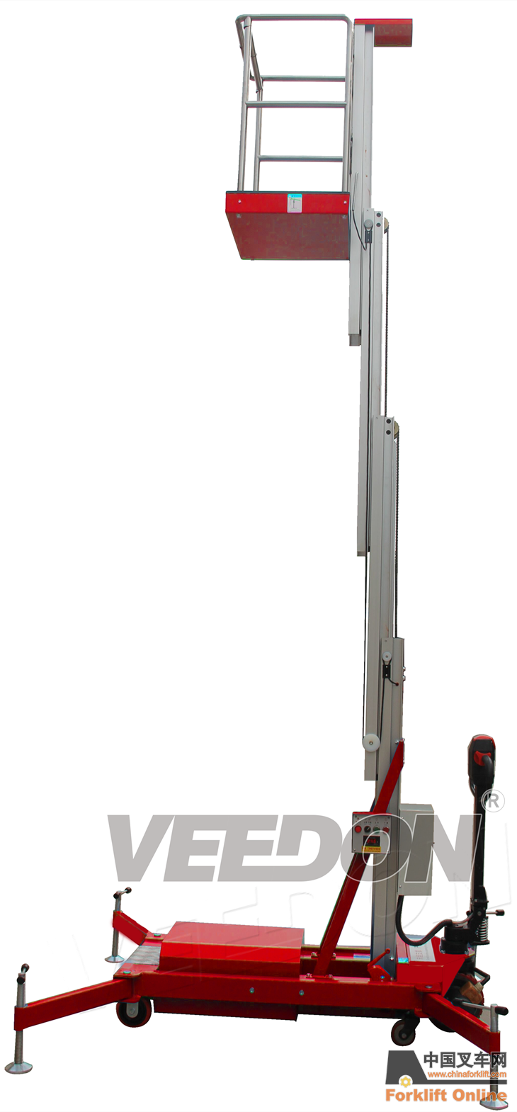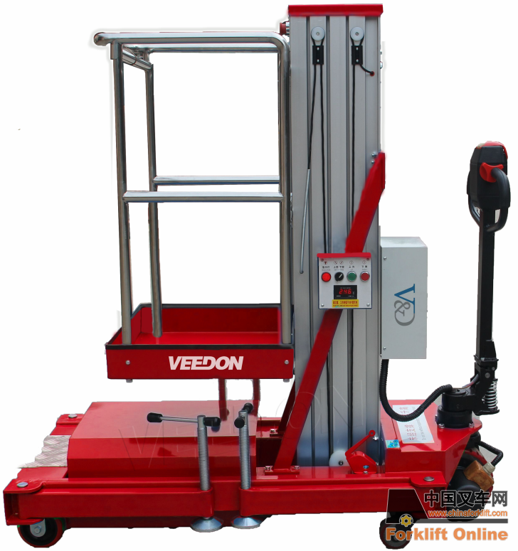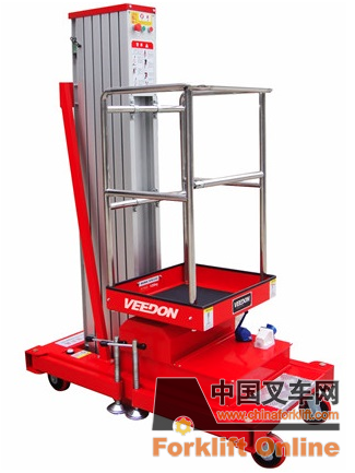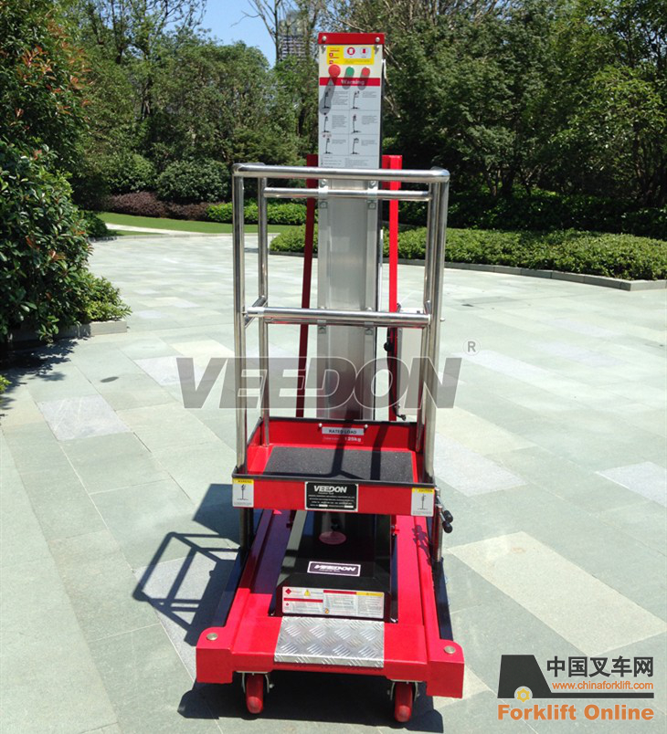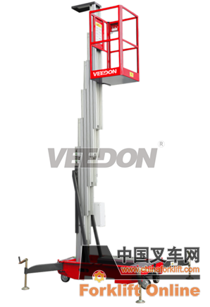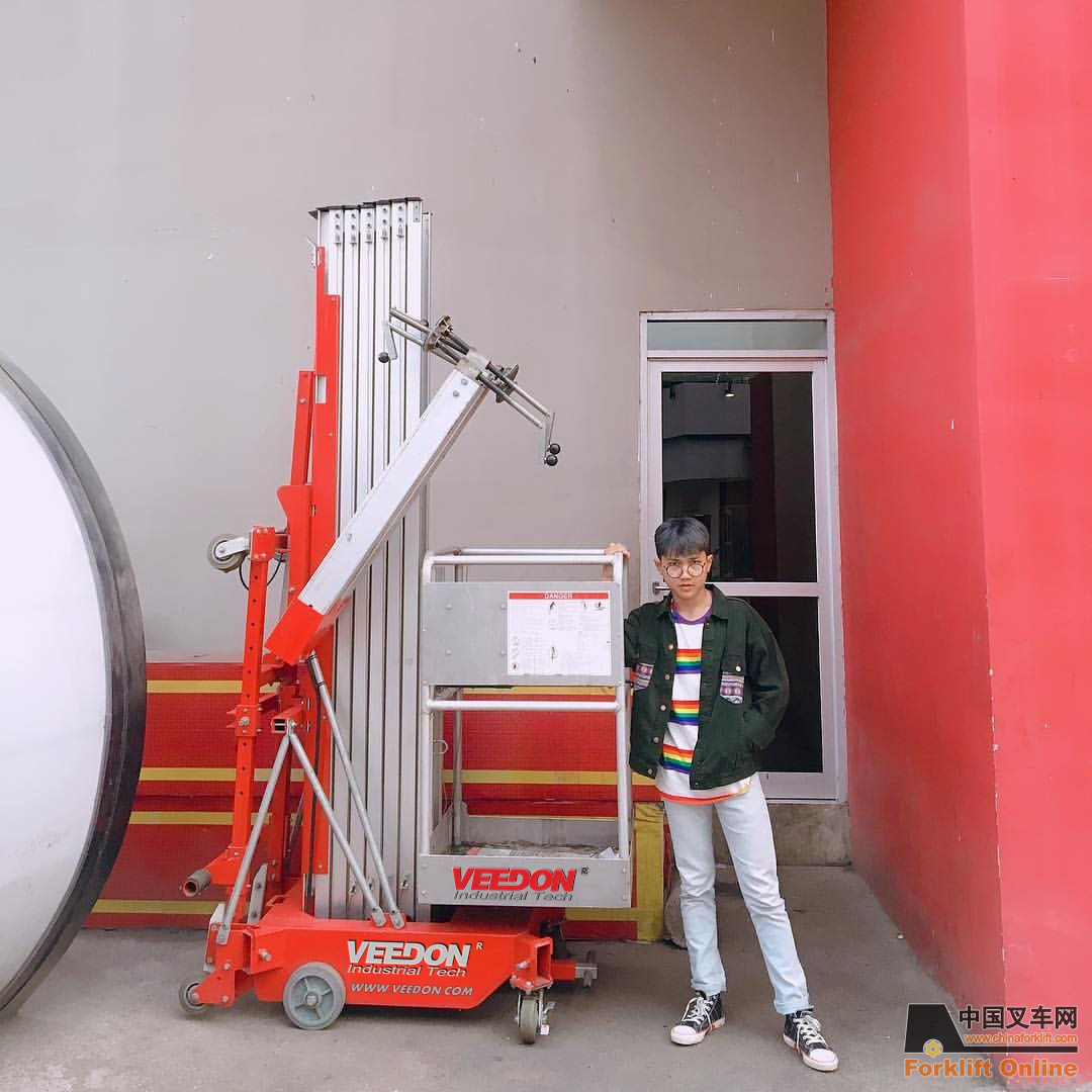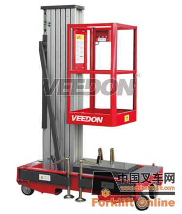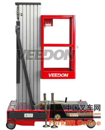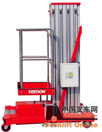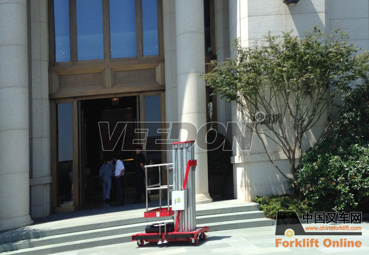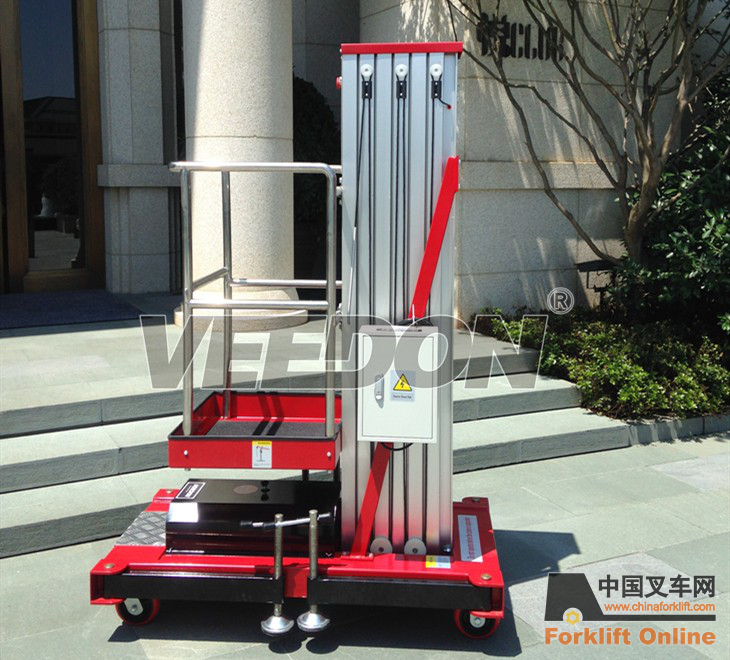Veedon单桅杆升降机铝合金材质机身,整机轻巧,方便移动、运输。工作平台上下方均安装操作按钮及应急停止按钮,轻巧的结构,专为酒店、办公楼、商场等场所设计,体积小,可非常容易的通过电梯门,高强度的航空铝合金材料机身