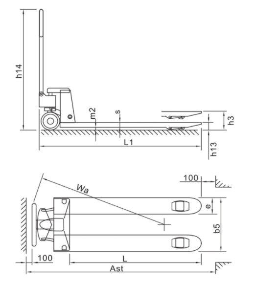 ■可选配:1)尼龙轮,聚胺脂轮,橡胶轮,单轮或双轮;2)货叉长度1150mm, 1220mm。
