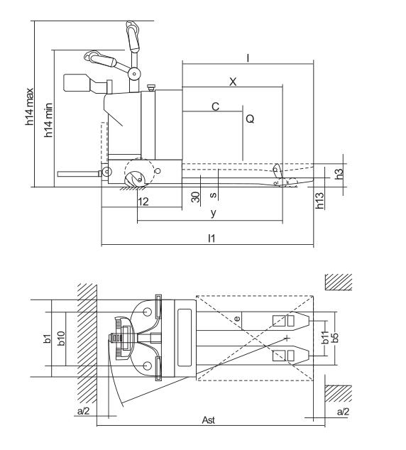 | 通道宽度,托盘1000x1200(1200跨货叉放置) | Ast(mm) | 2100/2400 |