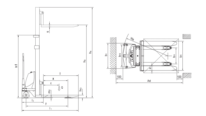 | 通道宽度,托盘1000x1200(1200跨货叉放置) | Ast(mm) | 2305 |