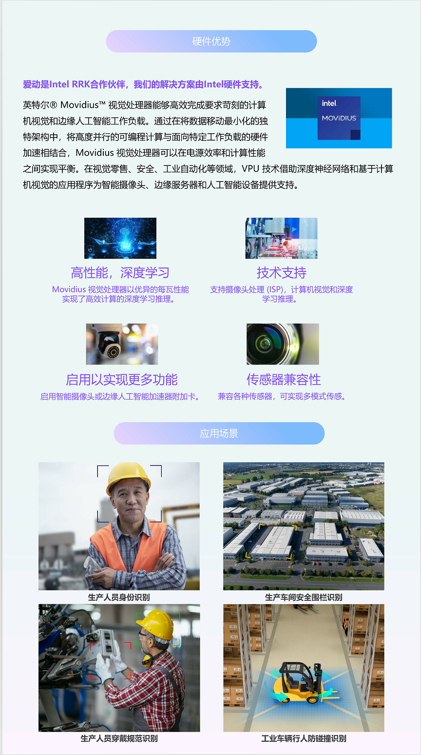 方案基于人工智能模式识别算法,对工厂全区域安全情况进行实时监测,实现防撞识别、人员识别两大核心功能。对工人的身份、着装以及操作情况、区域内碰撞风险进行全方位、全时段的智能监测及自动预警,保证工厂安全。