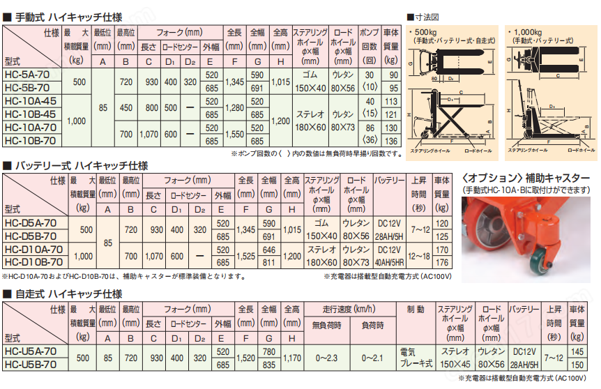 具有托盘卡车操作功能的搬运机。加工。易于组装到装配线。坚固性设计的2级液压缸1个。(HC10A-70/HC-10B-70)升程约2.5~配备了3倍的快速烘烤装置。