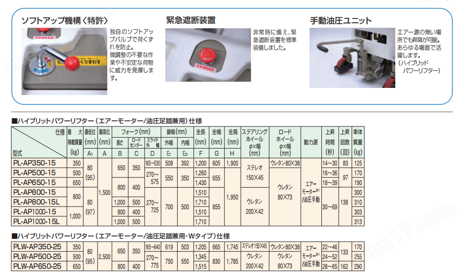 2、|通过手动液压单元,即使在没有空气源的情况下也能升降。(混合动力升降机)带软升机构,可自由控制升降机的上升速度。
