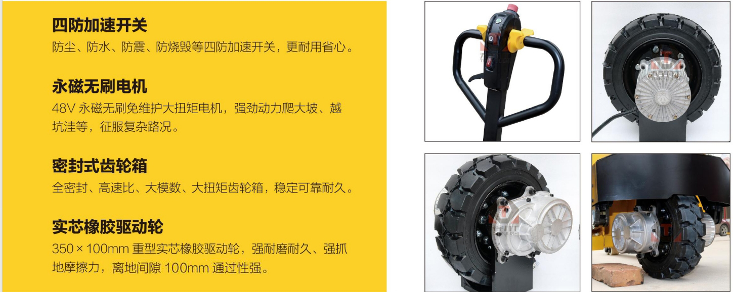 实芯橡胶驱动轮: 350x100mm 重型实芯橡胶驱动轮,耐磨耐久、强抓地摩擦力,离地间隙 100mm 通过性强。