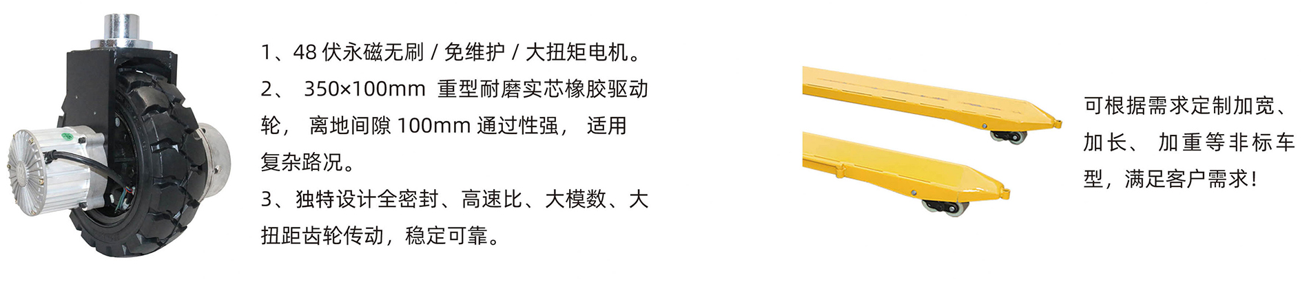 根据工作需求个性化定制:加宽、加长、窄体、托辊纸卷、超低货叉、重型大吨位等非标异型车,满足客户需求。