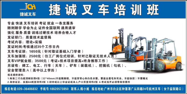 报名地址:广州市白云区钟落潭广从四路24号杭州叉车
