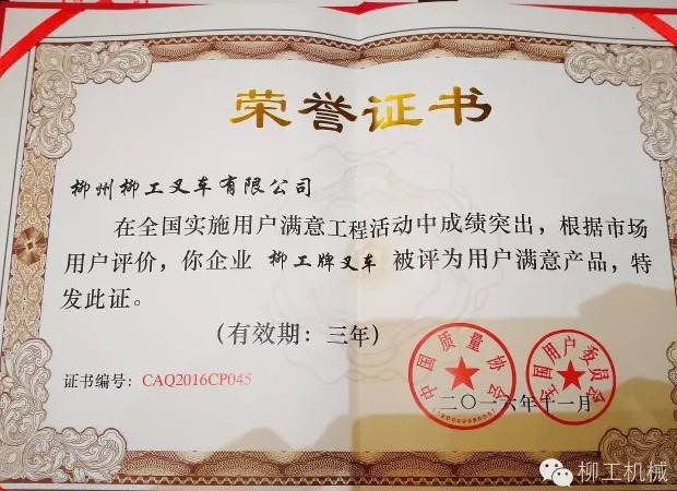 全国实施用户满意工程活动已推进整整20年,会议上对全国实施用户满意工程这二十年来的工作做了全面的总结并对优秀的组织和个人进行了表彰。历时半年,经第三方用户满意度测评、推荐单位推荐和专家评审,柳工叉车荣获“用户满意产品”奖。