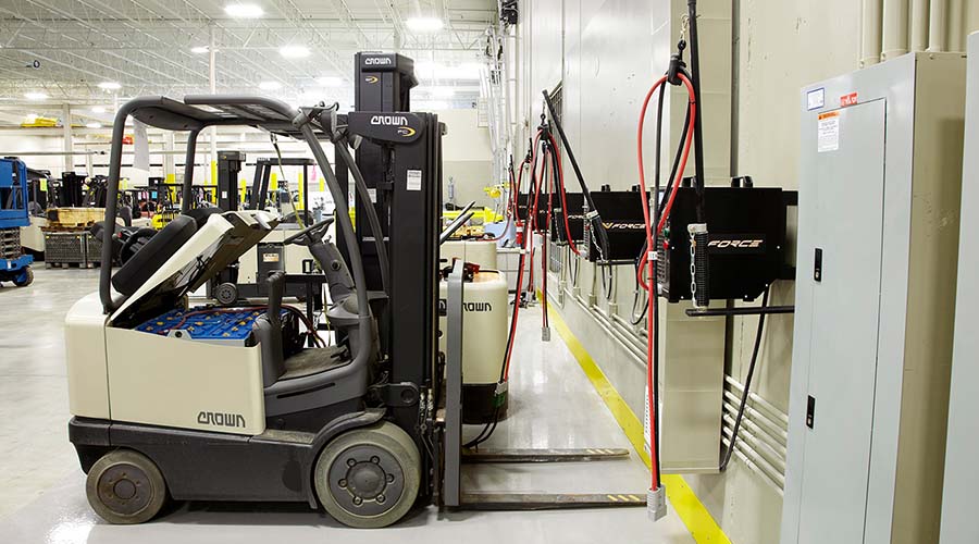 如何构建安全的叉车电池充电站合规设置:选择远离繁忙区的充电区域,配备必要的安全标识和设备。遵守安全规定:确保符合当地法规,如防爆设备和消防标准。