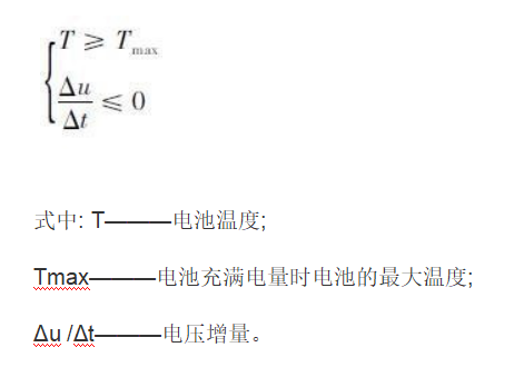 充电截止的判断方式,采用同时考虑温度和电压两个因素,设定最大截止温度和电压负增长两个条件,如下面的公式所示。