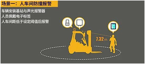 叉车UWB防撞系统解决方案核心优势:1、360°防撞预警同一区域实现叉车与人员叉车与叉车之间报警全覆盖。2、三级预警区域人员进入不同级别报警区域时,与基站连接的声光报警器发出报警。3、精准距离测试叉车上的基站能实时测量与周围100米内标签的精准距离,精度可达10厘米。4、限速/停车当车辆或人员距离太近时叉车自动限速或停车。5、双重控制声光警示,主动预警叉车限速,强制预防!