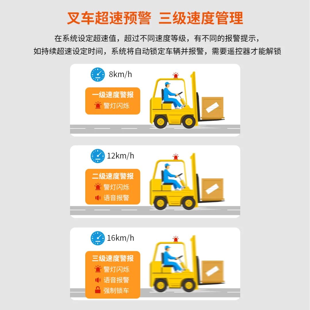 当叉车速度达到16Km/h,警示灯闪烁的同时,发出“超速,请注意”的语音报警;若叉车速度持续超过16Km/h,系统将自动锁定车辆并报警音,需要管理员拿遥控器才能解锁。