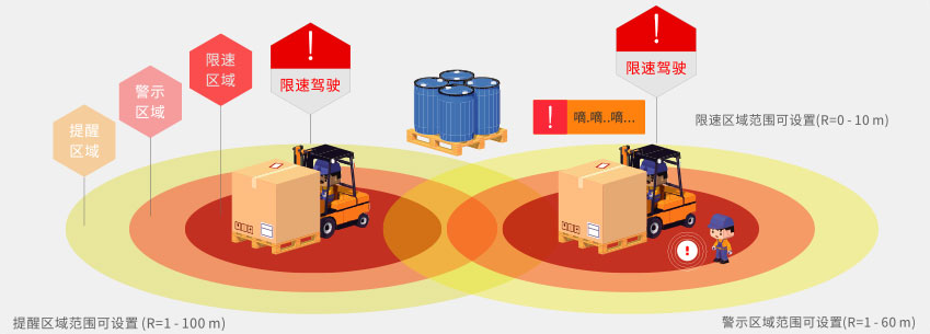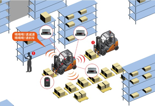 车与物进行主动防撞:叉车的四面均安装超声波探头,当车辆行驶或倒车时接近障碍物(如货物堆放、货架等),叉车可实现在相应设定距离下的报警及减速最后停止以保证物品及车辆安全。