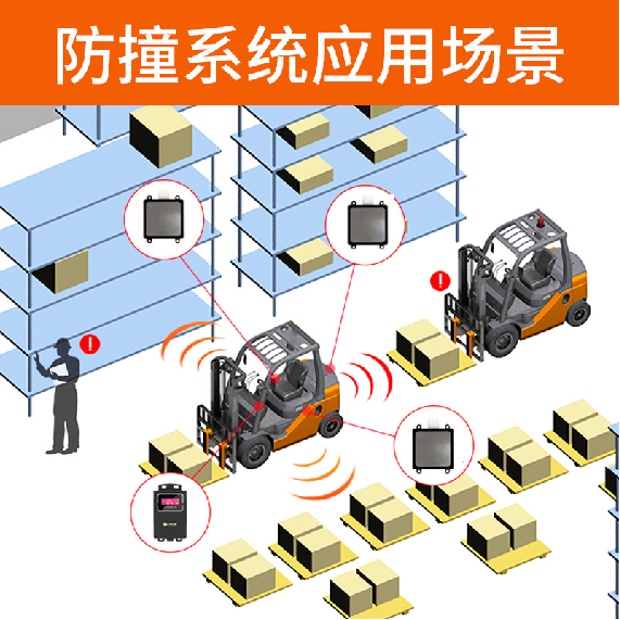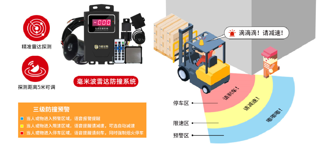 叉车倒车作业时毫米波雷达开始工作,5米范围内检测到人或物开始报警提醒驾驶员,防止驾驶员视线原因无法注意到障碍物;增加无线测速传感器,针对叉车速度进行监测,叉车超速语音报警,防止驾驶员超速驾驶; 达到危险距离语音报警请刹车,防止距离过近发生碰撞事故; 选配安装油门控制器,超速或者达到限速距离,强制限速;选配安装停车装置 ,危险停车的距离强制停车;