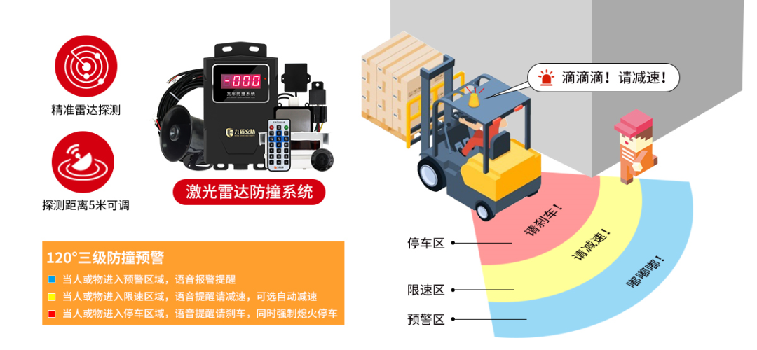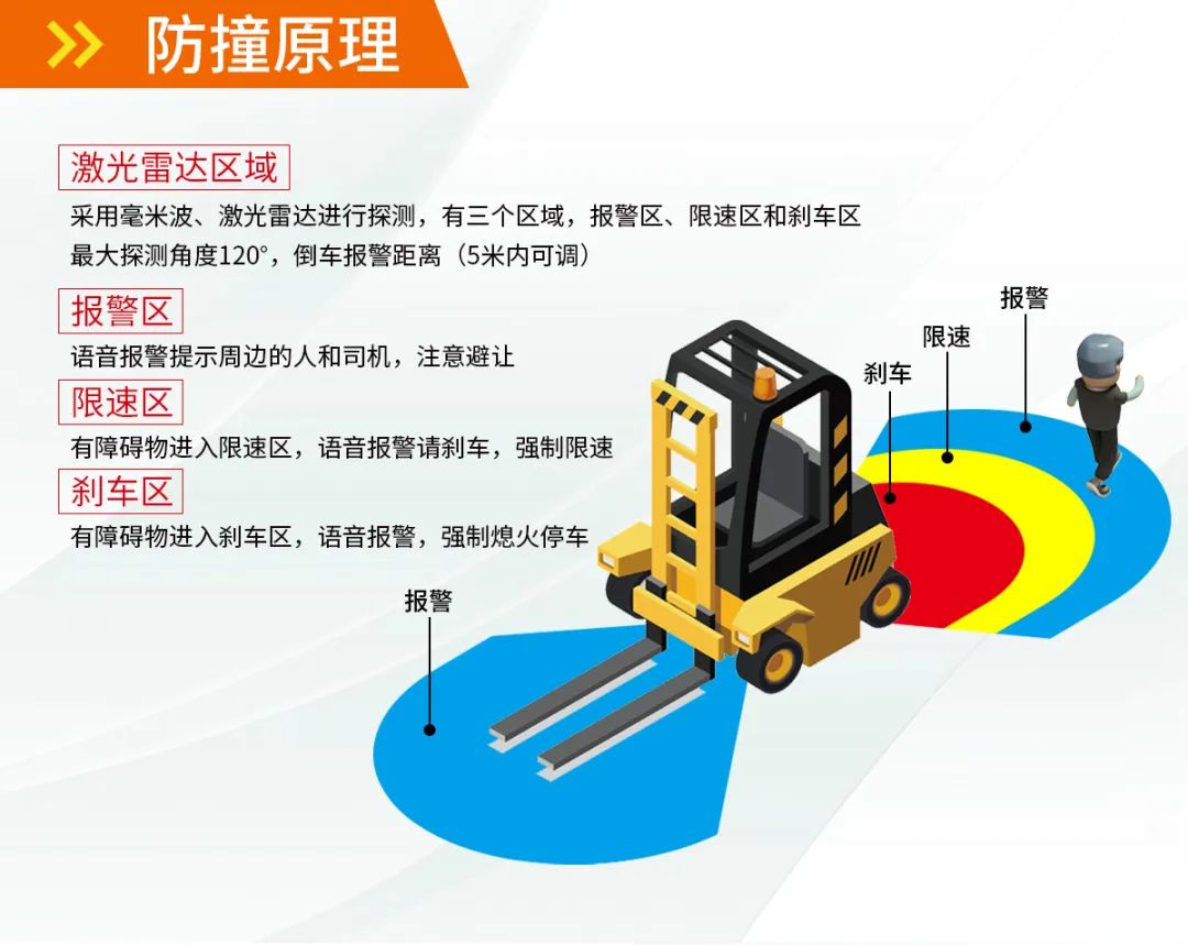 叉车倒车作业时雷达开始工作,5米范围内检测到人或物开始报警提醒驾驶员,防止驾驶员视线原因无法注意到障碍物;增加无线测速传感器,针对叉车速度进行监测,叉车超速语音报警,防止驾驶员超速驾驶; 达到危险距离语音报警请刹车,防止距离过近发生碰撞事故; 选配安装油门控制器,超速或者达到限速距离,强制限速;选配安装停车装置 ,危险停车的距离强制停车;