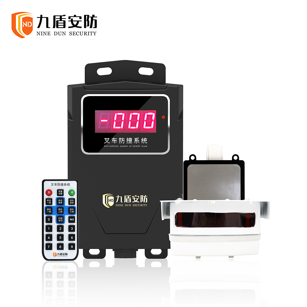 广州九盾安防雷达叉车防撞系统是通过超声波探头对障碍物进行探测,在探测范围内根据不同距离进行语音报警,达到危险距离语音报警喊停车,同时信号输出给执行器,不同的执行器达到的效果不同,为选配项目,选配功能为强制限速或强制熄火;