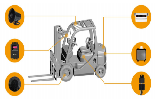 叉车倒车作业时雷达开始工作,5米范围内检测到人或物开始报警提醒驾驶员,防止驾驶员视线原因无法注意到障碍物;增加无线测速装置,针对叉车速度进行监测,叉车超速语音报警,防止驾驶员超速驾驶; 达到危险距离语音报警请刹车,防止距离过近发生碰撞事故; 选配安装油门控制器,超速或者达到限速距离,强制限速;选配安装熄火装置 ,危险停车的距离强制熄火停车;