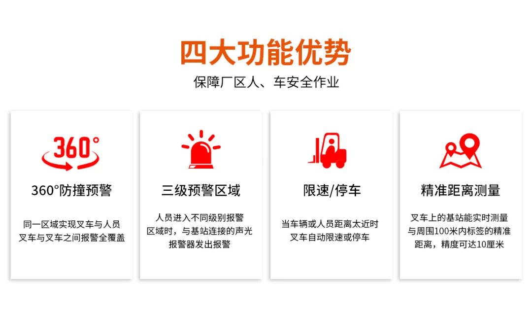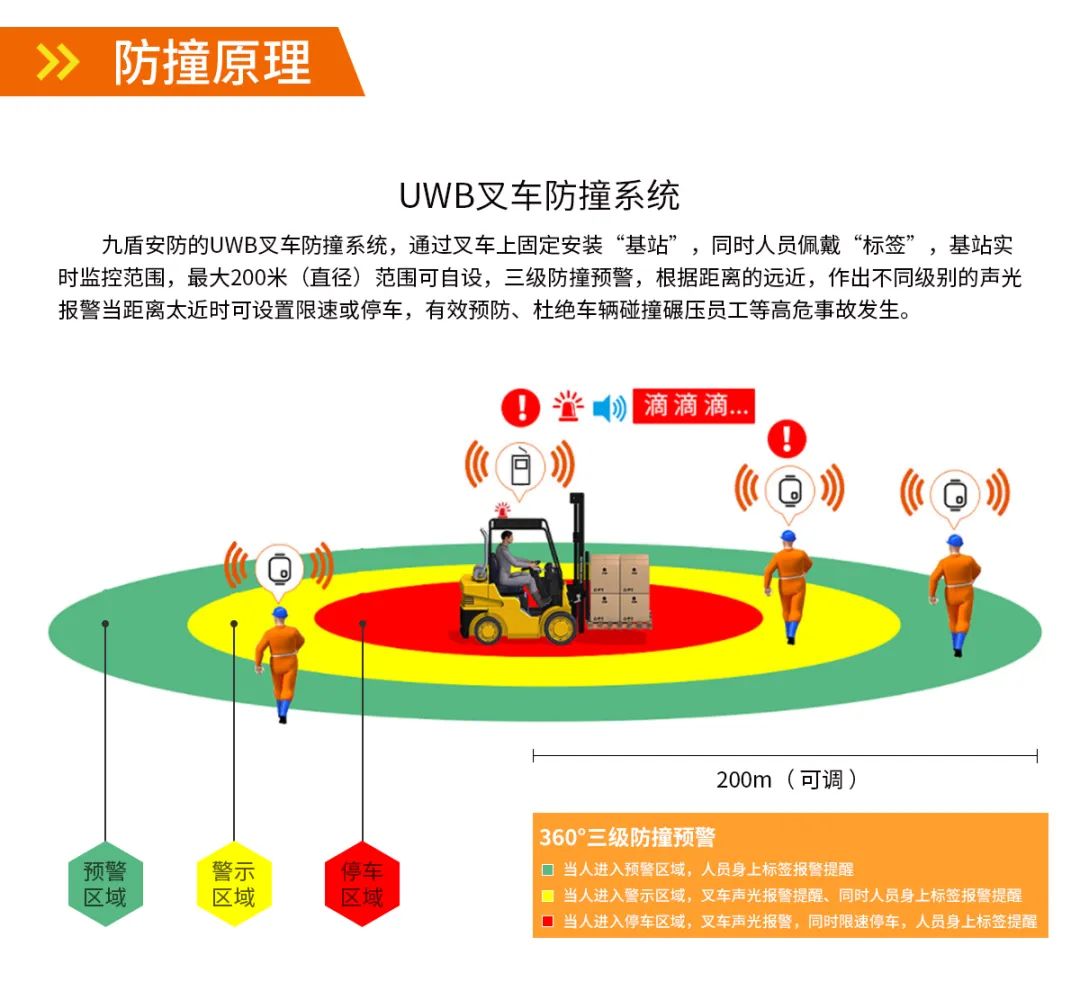 叉车防撞预警系统是通过声音和光向人们发出示警信号的一种预警装置,当叉车进入防撞或预警区域时本系统会立即发出示警信号,避免行人、叉车事故发生。